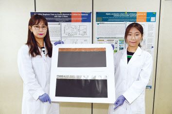 전기연 연구진이 실리콘·그래핀 복합 음극재 기반 대면적 음극 및 양극을 들고 있다. [한국전기연구원 제공] |