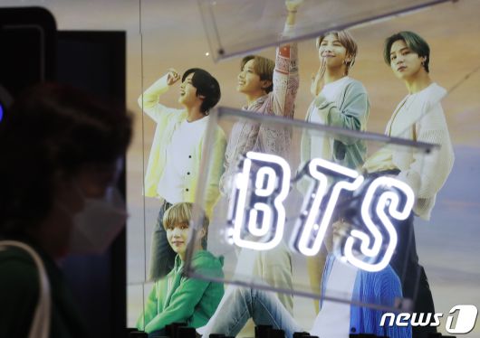 7일 오후 서울 중구 롯데면세점에 마련된 BTS의 포토존 앞을 시민들이 지나가고 있다. 그룹 방탄소년단(BTS) 정국, 지민, RM, 뷔, 제이홉, 슈가, 진은 'Butter'로 미국 빌보드 메인 싱글 차트인 '핫 100'에서 6주째 1위를 지키며 명실상부한 '21세기 팝 아이콘'임을 또다시 입증했다. 2021.7.7/뉴스1 © News1 권현진 기자 |