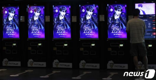 (서울=뉴스1) 권현진 기자 = 30일 오후 서울 용산구 CGV 영화관 티켓박스에 오는 9월 1일 생일을 맞는 방탄소년단(BTS) 정국의 생일 축하 광고가 나오고 있다.