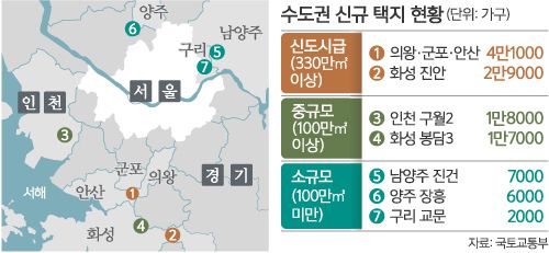 국토교통부가 이날 발표한 신규택지 중 가장 규모가 큰 곳은 경기 의왕·군포·안산(586만㎡)과 화성 진안지구(452만㎡)다. 각각 서울 여의도 면적의 2배와 1.5배 규모의 신도시가 될 전망이다.