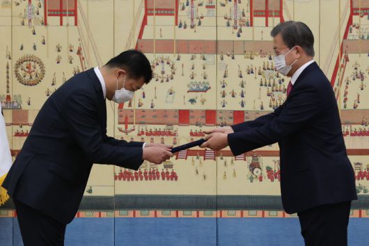 문재인 대통령이 청와대에서 최태호 주아프가니스탄대사에게 신임장을 수여하고 있다. 연합늇