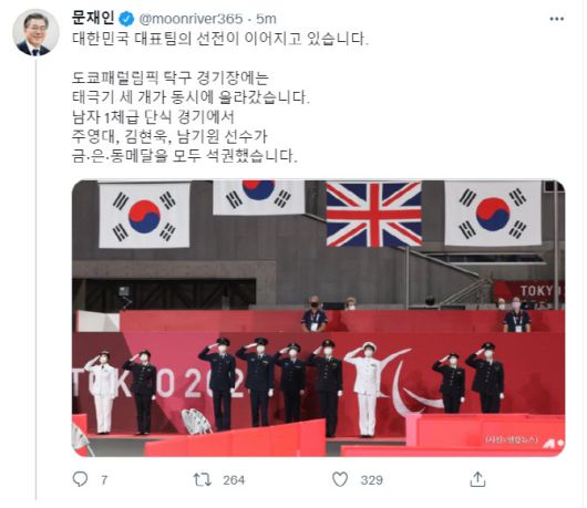 [이데일리 김정현 기자] 문재인 대통령이 “첫 금메달 소식을 전해준 ‘탁구 1체급’에서 우리 선수들은 강한 정신력과 경기력을 보여줬다”면서 2020 도쿄패럴림픽 우리 선수단을 격려했다.