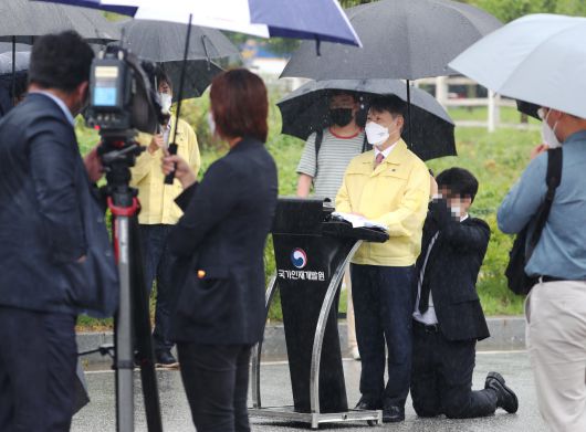 강성국 법무부 차관이 지난 27일 오전 충북 진천 국가공무원인재개발원에서 아프가니스탄 특별입국자 초기 정착 지원과 관련해 브리핑하는 도중 관계자가 뒤쪽에서 무릎을 꿇고 우산을 받쳐주고 있다. [사진=연합뉴스] |