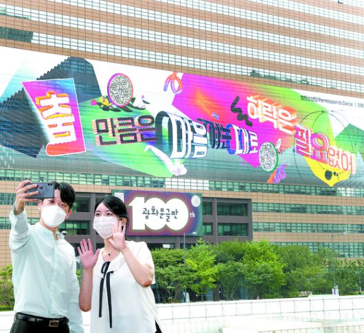 30일 서울 세종대로 교보빌딩에 방탄소년단(BTS)이 쓴 100번째 광화문 글판이 게시돼 있다. ‘춤 만큼은 마음 가는 대로, 허락은 필요 없어’라 쓰인 글귀는 BTS의 노래 ‘퍼미션 투 댄스’의 가사를 인용한 것으로 코로나 극복 메시지가 담겼다.