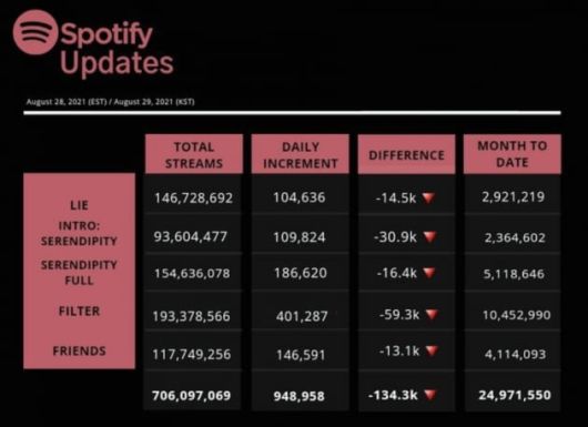 스포티파이에서도 '필터'는 스트리밍 수 1억 9300만(8월 27일 기준) 스트리밍을 최단 기간 기록했다.