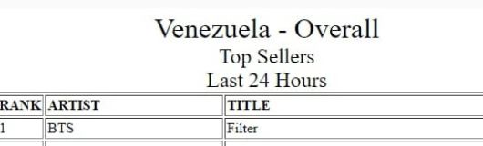 한국 시간으로 30일, ‘필터’는 베네수엘라 (Venezuela) 아이튠즈 차트에서 1위를 기록하며 114번 째로 아이튠즈 1위 국가에 이름을 올렸다.