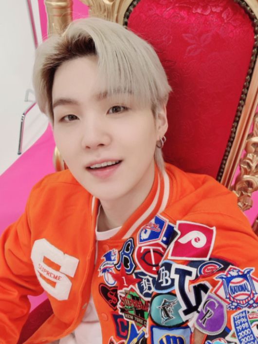 사진 속 슈가는 밝게 웃고 있다.