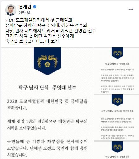 (서울=연합뉴스) 조민정 기자 = 문재인 대통령은 31일 도쿄 패럴림픽 탁구와 사격 경기에서 메달을 획득한 4명의 선수에게 축전을 보내 "국민과 함께 응원하겠다"고 격려했다.