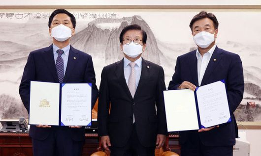 박병석 국회의장(가운데)과 더불어민주당 윤호중 원내대표(오른쪽) 국민의힘 김기현 원내대표가 31일 서울 여의도 국회 의장실에서 언론중재법 개정안을 위한 협의체 구성, 9월 27일 본회의 상정 등의 합의문을 보여주고 있다. 연합뉴스 |