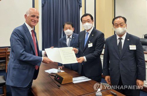 애덤 스미스 미국 하원 군사위원장(왼쪽)이 지난 7월 28일 미국을 공식 방문 중인 민홍철 단장 등 국회 국방위원회 대표단과 면담에 앞서 서한을 전달받고 있다. [국회 국방위원회 제공. 재판매 및 DB금지] |