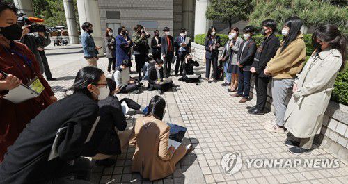 법원 판결 관련 기자회견하는 쩡이린씨 친구들 |