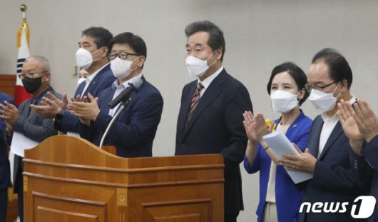 (부산=뉴스1) 여주연 기자 = 더불어민주당 대권 주자인 이낙연 전 대표가 1일 오전 부산 연제구 부산시의회 대회의실에서 민주당 소속 부산광역시 광역의원·기초의원들에게 지지선언문을 전달 받은 후 발언하고 있다. 2021.9.1/뉴스1 |