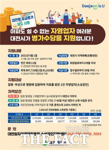 대상은 대전에 거주 및 사업장을 운영하고 건강보험 지역가입자 중 기준 중위소득 150% 이하인 자영업자로 이날 이후 질병·부상 등으로 병원에 입원해 진료를 받은 경우에 해당된다.
