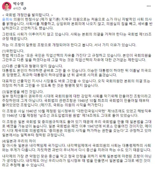 박 의원은 "일본은 내각책임제 국가로, 내각책임제에서 국회의원의 사퇴는 자칫하면 과반이 무너져서 다시 총선을 치러야 하는 수도 있어 잦은 총선을 막고 정국 안정을 꾀하기 위해 일본법에 마련된 조항이 아닌가 한다"며 "내각제도 아닌 우리나라가 임시정부 때 법을 만들면서 일본법을 그대로 베낄 것이라고 추정해 볼 수 있다"고 소개했다.