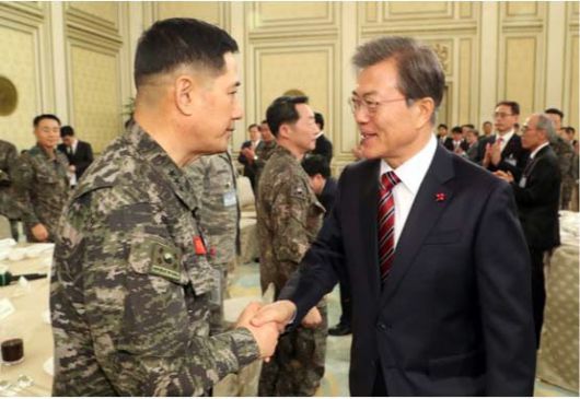 문재인 대통령이 2017년 12월 8일 청와대 영빈관에서 열린 전군 주요지휘관 격려 오찬에서 당시 전진구 해병대 사령관과 인사하고 있다 (사진=청와대 사진기자단) |