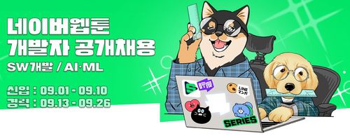 (서울=연합뉴스) 채새롬 기자 = 네이버웹툰은 9월 한 달 동안 신입·경력 개발자 부문 공개채용을 한다고 2일 밝혔다. 채용 규모는 세 자릿수다.