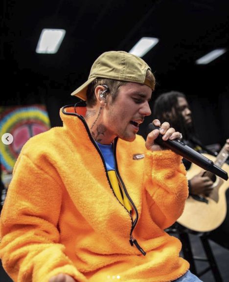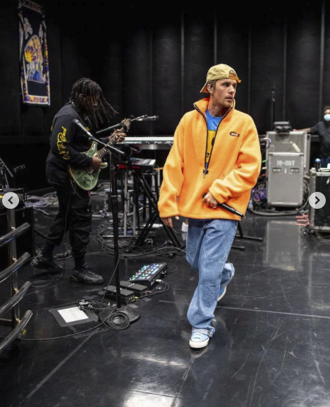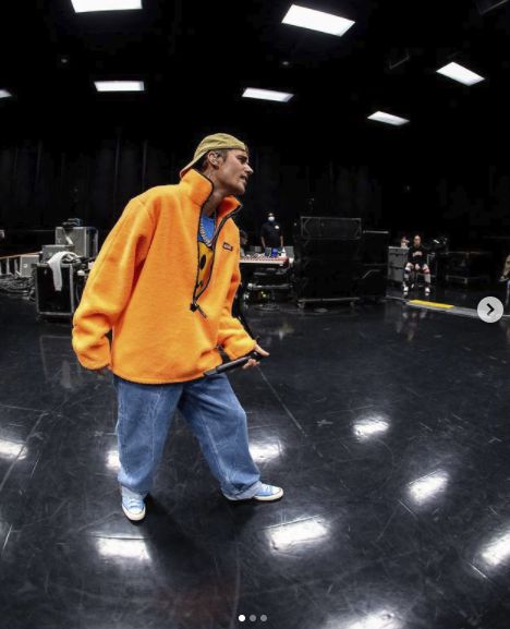 저스틴 비버는 2일(한국시간) 자신의 인스타그램 계정에 사진 여러 장을 올렸다. 사진에서 그는 오렌지 컬러의 캐주얼 재킷과 와이드 데님팬츠를 입고서 마이크를 들고 있다.