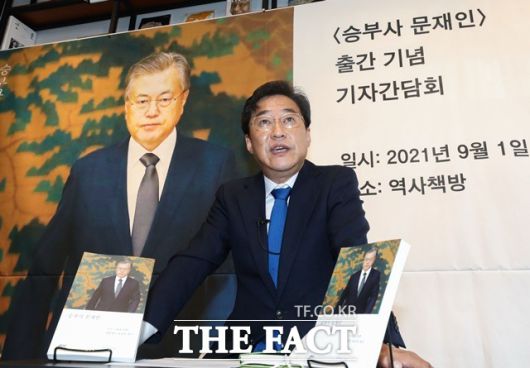 강민석 전 청와대 대변인이 지난 1일 오전 서울 종로구 역사책방에서 열린 '승부사 문재인' 출간 기념 기자간담회에서 발언하고 있다. /뉴시스 |