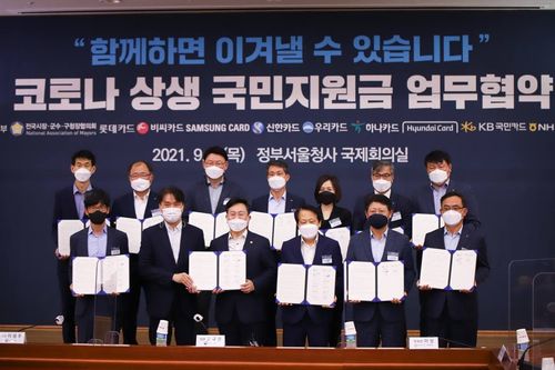 정부서울청사 별관 3층 국제회의장에서 열린 협약식에는 시장군수구청장협의회 이성 상임부회장(서울 구로구청장), 고규창 행정안전부 차관과 금융위원회, 한국간편결제진흥원, 신한카드 등 9개 카드사 대표들이 참석해 국민지원금 지급 업무를 위한 상호협력에 합의했다.