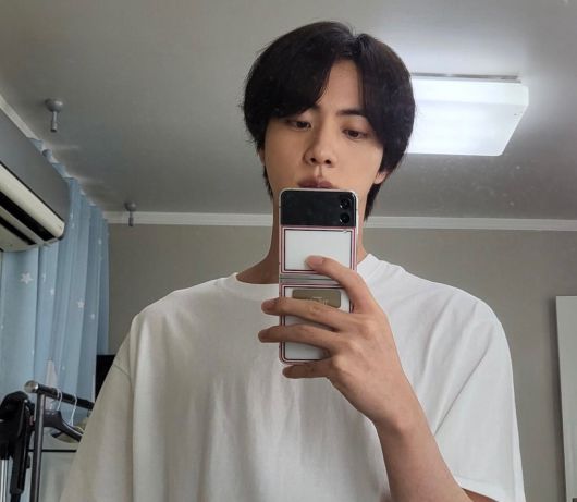 진은 깔끔한 흑발에 별다른 화장이나 악세사리 하나 없이 깨끗한 피부와 심플한 흰 티와 청바지만으로도 빛나는 비주얼과 우월한 피지컬을 선보이는 셀카로 글로벌 팬심을 흔들었다.