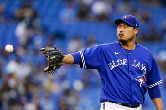 토론토 류현진이 1일(한국시간) 캐나타 온타리오주 토론토 로저스 센터에서 열린 볼티모어 오리올스와의 경기에서 공을 받고 있다. 온타리오주 | USA TODAY Sports연합뉴스 |