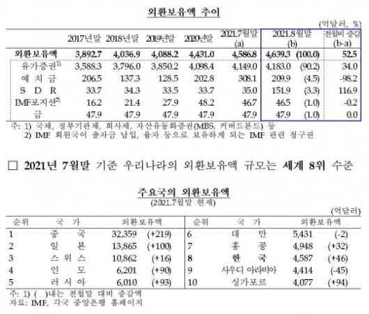 한국은행이 3일 발표한 '2021년 8월 말 외환보유액'에 따르면, 8월 말 한국 외환보유액은 4639억3000만 달러로 전월말 대비 52억5000만 달러 증가했다. 2개월 연속 증가다.