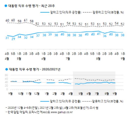여론조사 전문기관 한국갤럽이 3일 발표한 9월 1주차(8월 31일~9월 2일 조사) 결과를 보면, 문 대통령의 직무수행을 긍정 평가한 응답자는 38%로 전주와 같았다. 부정평가는 전주 대비 2%포인트 하락한 52%였다. 그 외는 의견을 유보했다.
