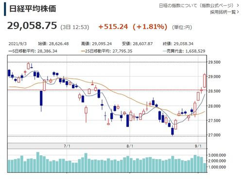 닛케이225 평균주가가 장중 29,000선을 회복한 것은 지난 6월 하순 이후 약 2개월 만이다.