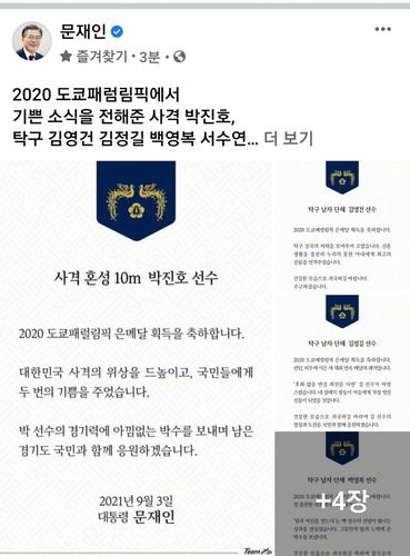 (서울=연합뉴스) 임형섭 기자 = 문재인 대통령은 3일 도쿄 패럴림픽 탁구와 사격 경기에서 메달을 딴 7명의 선수에게 축전을 보냈다.