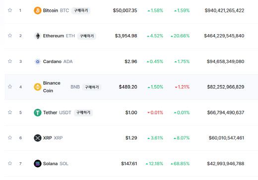 4일 글로벌 코인시황 중계사이트 코인마켓캡에 따르면 비트코인은 이날 오전 9시 30분 현재(한국시간) 전일 대비 1.58% 상승한 5만달러대를 기록하고 있다. 간밤 비트코인은 지난 5월 14일 이후 약 3개월 만에 장중 5만1000달러를 넘어서기도 했다.