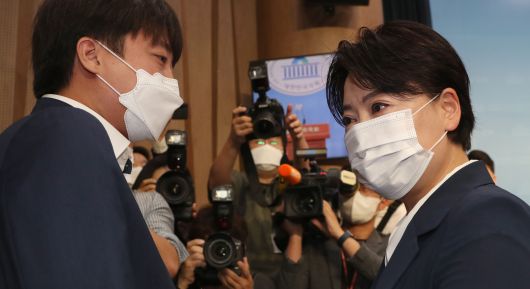 25일 국민권익위원회 조사 결과 부동산 관련 불법 의혹이 제기된 윤희숙 의원의 의원직 및 대선후보 사퇴 기자회견장을 찾은 이준석 대표가 윤 의원의 손을 잡고 사퇴 의사 철회를 요청하고 있다./이덕훈 기자 |