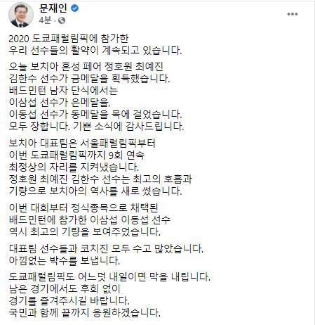 문 대통령은 이날 SNS를 통해 보치아 혼성 페어에서 금메달을 획득한 정호원·최예진·김한수 선수와 배드민턴 남자 단식 은메달 이삼섭, 동메달 이동섭 선수를 향해 이같이 말했다.