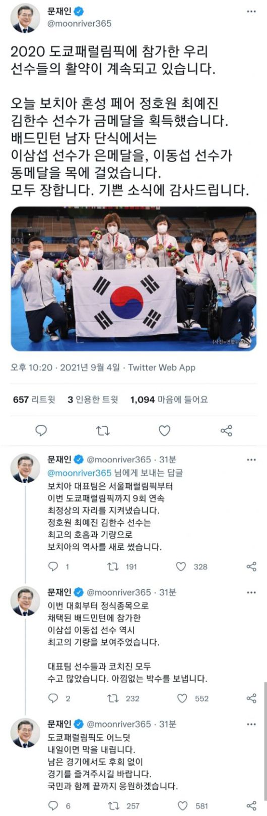 문재인 대통령은 4일 도쿄패럴림픽 선수들의 선전과 관련해 사회관계망서비스(SNS)에 "정호원 최예진 김한수 선수는 최고의 호흡과 기량으로 보치아의 역사를 새로 썼다"고 평가했다.
