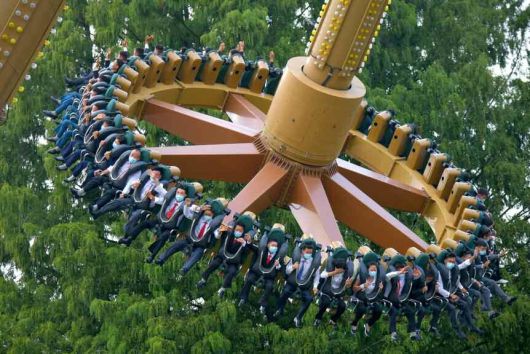 북한 청년절(8월28일) 경축 행사 참가자들이 평양에 머물면서 여러 정치문화사업에 참여했다고 노동당 기관지 노동신문이 지난달 31일 보도했다. 사진은 개선청년공원유희장과 릉라인민유원지에서 놀이기구를 타는 모습. 평양 노동신문=뉴스1 |