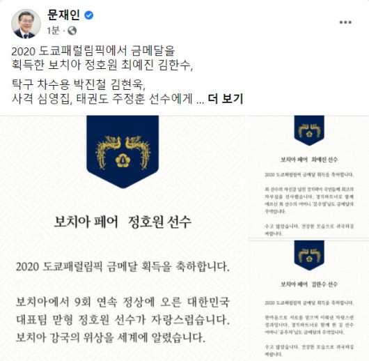 문 대통령은 보치아 페어 금메달 정호원 선수에 “보치아에서 9회 연속 정상에 오른 대한민국 대표팀 맏형 정호원 선수가 자랑스럽다. 보치아 강국의 위상을 세계에 알렸다”고 축하했다.