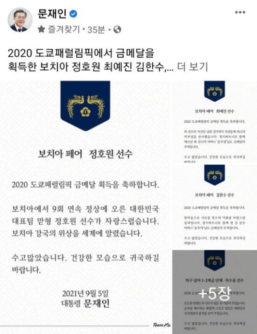문 대통령은 5일 사회관계망서비스(SNS)에 올린 글에서 "2020 도쿄패럴림픽에서 금메달을 획득한 보치아 정호원 최예진 김한수, 탁구 차수용 박진철 김현욱, 사격 심영집, 태권도 주정훈 선수에게 축전을 보냈다. 국민들과 함께 축하한다"고 말했다.