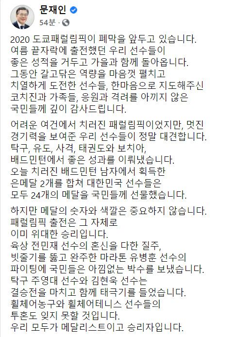 문 대통령은 “어려운 여건에서 치러진 패럴림픽이었지만, 멋진 경기력을 보여준 우리 선수들이 정말 대견하다”며 “탁구, 유도, 사격, 태권도와 보치아, 배드민턴에서 좋은 성과를 이뤄냈다. 오늘 치러진 배드민턴 남자에서 획득한 은메달 2개를 합쳐 대한민국 선수들은 모두 24개의 메달을 국민들께 선물했다”고 했다.