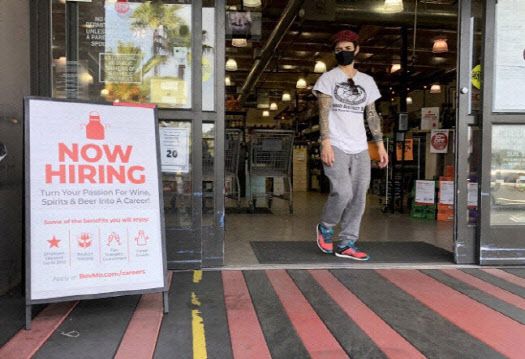 미국 캘리포니아주에 위치한 주류 체인 ‘베브모’에 구인 광고 간판이 걸려 있다. (사진=AFP 제공) |