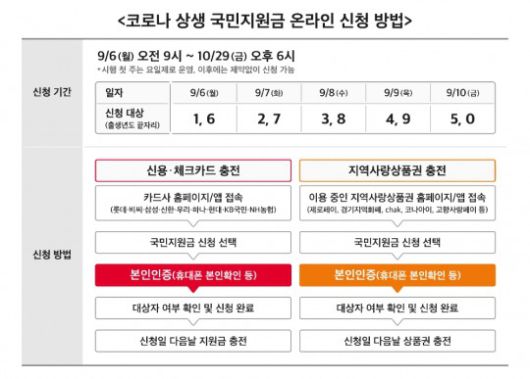 1인당 25만원씩 지급받는 코로나 상생 국민지원금은 오늘(6일) 오전 9시부터 오는 10월 29일 오후 6시까지 신청 접수를 받는다. 지자체와 신용카드사의 홈페이지를 통해 온라인으로 신청할 수 있으며, 휴대폰 본인인증 또는 공동인증서를 통한 본인 확인 절차를 거쳐야 한다.