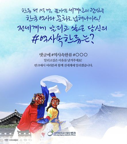 (서울=연합뉴스) 왕길환 기자 = 사이버 외교 사절단 반크는 세계 한류 팬 1억명을 활용해 한국 역사와 문화를 알려 나가는 '#역사 속 한류' 캠페인을 한다고 6일 밝혔다.