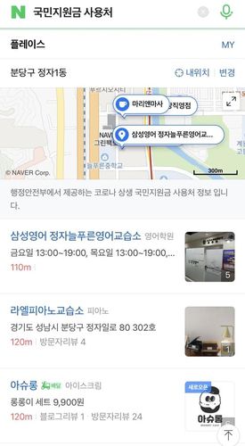 '국민지원금 사용처'와 같은 기본 키워드로 검색하면 사용자 위치 주변에서 지원금을 사용할 수 있는 업체가 노출된다.