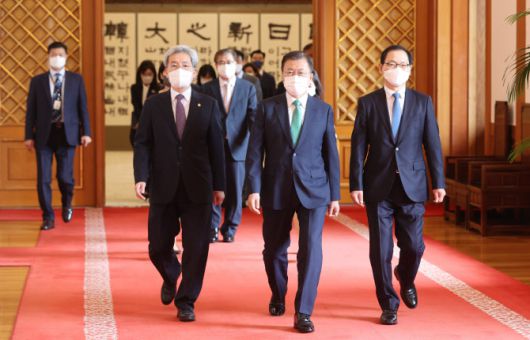 문재인 대통령이 6일 청와대에서 고승범 금융위원장, 박종수 북방경제협력위원장에게 임명장을 수여하고 접견실로 이동하고 있다.(사진=연합뉴스) |