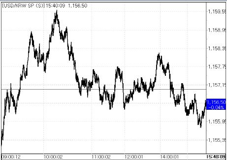 오전 장중 한 때 수입업체의 결제(달러 매수) 수요가 네고(달러 매도)대비 우위를 보이면서 1159.60원까지 오르기도 했지만 오후들어 다시 하락하는 모습을 보였다.
