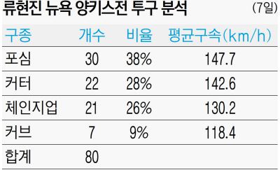 양키스는 류현진을 맞아 좌타자 3명, 우타자 6명을 섞은 라인업을 냈고, 류현진은 이들을 모두 효과적으로 잡아냈다. 류현진은 이날 체인지업보다는 우타자 몸쪽 낮은 쪽으로 빠르게 공략하는 커터성 슬라이더를 많이 구사했다. 류현진의 바깥쪽 체인지업을 머릿속에 둔 우타자에게 몸쪽 낮은 코스의 커터는 더욱 효과적인 무기가 된다.