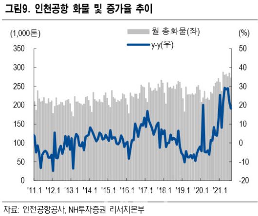 지난달 국제선 화물 수송량은 27만2384톤으로 전년 대비 18.3% 늘었다. 최근 항만 적체 상황이 여전한 가운데 베트남, 상하이 공항 등의 운영 차질로 항공 화물 운임이 상승하고 있다.