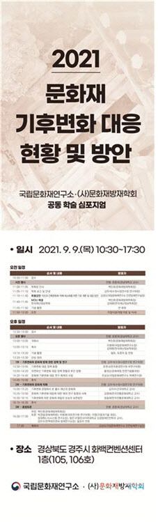 이번 학술 발표회는 문화재 방재 관련 학술단체인 문화재방재학회와 함께 국가 기후변화 대응 정책에 따른 문화재 분야의 대응 현황과 방향을 모색하기 위해, 관계 전문가를 초청해 주제 발표와 토론을 진행하는 자리로 마련됐다.