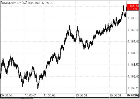8일 서울외국환중개에 따르면 환율은 전 거래일 종가(1157.80원)보다 8.90원 오른 1166.70원에 마감했다. 지난달 30일 1167.00원을 찍은 이후 7거래일 만에 최고치를 보인 것이다. 이날 환율은 전 거래일 종가(1157.80원)보다 5.20원 상승한 1163.00원에 출발해 1160원대 초중반에서 등락하다가 오후 들어 상승폭을 키웠다. 환율이 8.90원이나 오른 것은 지난 6월 17일 13.2원 오른 이후 최대폭 상승이다.