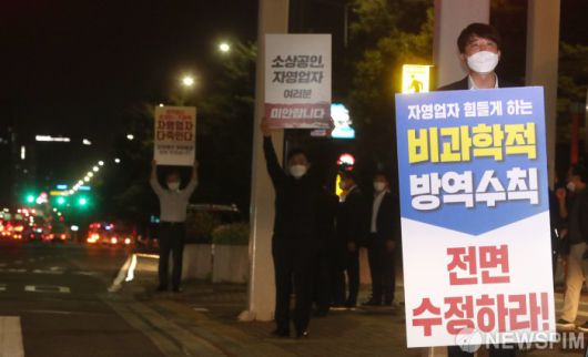 [서울=뉴스핌] 김학선 기자 = 이준석 국민의힘 대표와 원희룡, 최재형 대선 예비후보가 9일 새벽 서울 영등포구 여의대로에서 정부의 사회적 거리두기 재연장 조치에 반발해 전국 동시 야간 차량시위를 하는 자영업자들을 지지하며 피켓을 들고 있다. 2021.09.09 yooksa@newspim.com 저작권자(c) 글로벌리더의 지름길 종합뉴스통신사 뉴스핌(Newspim), 무단 전재-재배포 금지