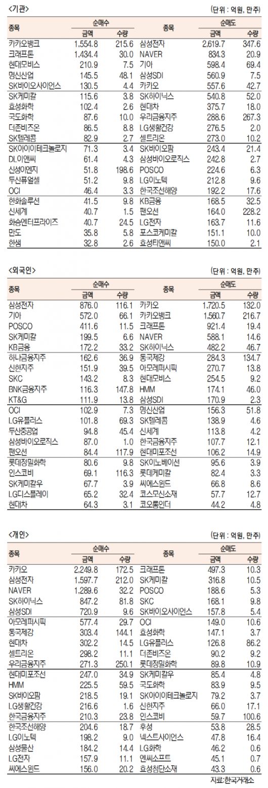[표]유가증권 기관·외국인·개인 순매수·도 상위종목(9월 9일)