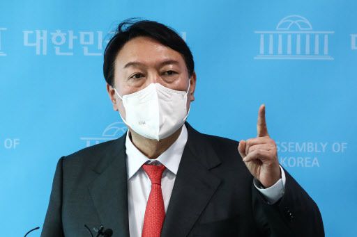 국민의힘 대권주자인 윤석열 전 검찰총장이 8일 서울 여의도 국회 소통관에서 ‘고발사주’ 의혹과 관련해 입장을 밝히고 있다.(사진=국회사진취재단) |
